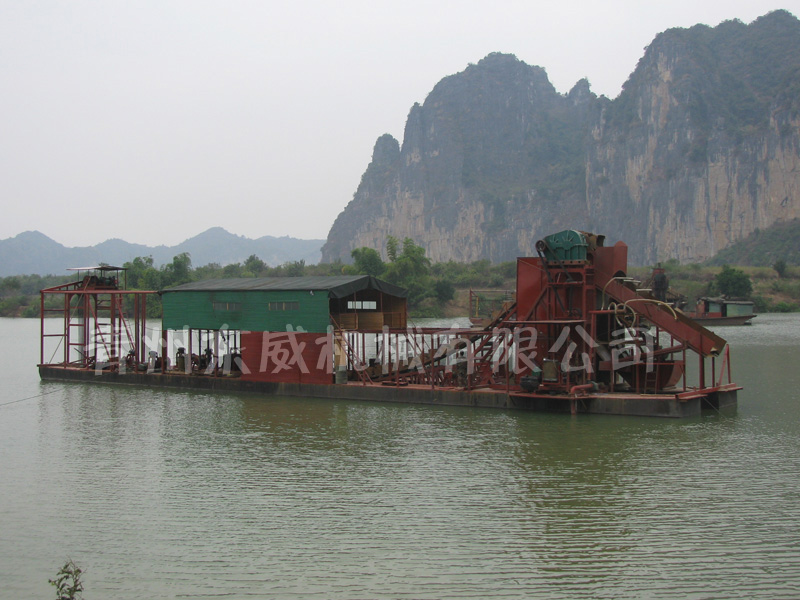 淘金船是一种集采矿作业、选矿作业为一体的水上联合工厂,是一种砂金、铁粉、锡矿、钨矿等重金属开采设备,它包括链斗挖掘系统、选矿及供水系统、废矿及尾矿排弃系统、甲板机械、船体、上部钢构、供电等几个基本系统。