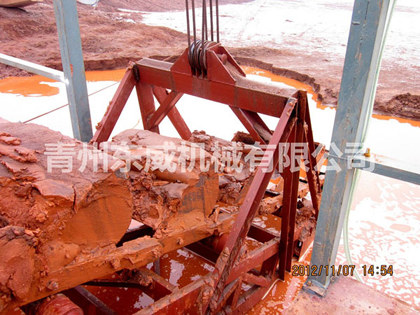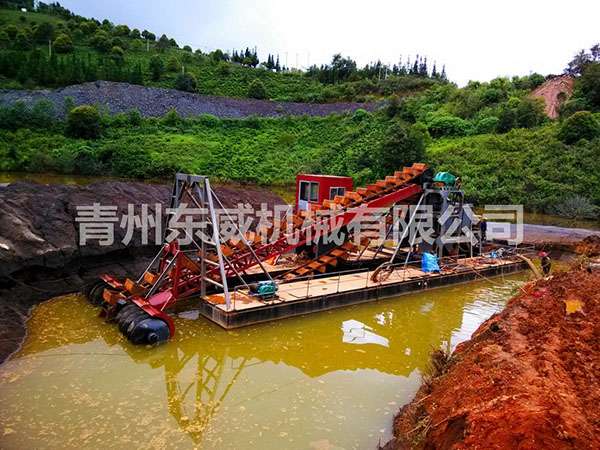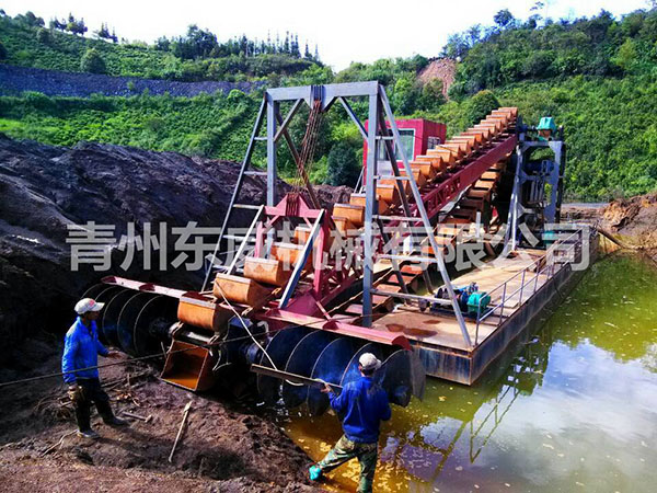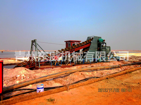 该设备为分体、链斗式挖掘机械,浮体采用横骨架式分体箱形结构,装有定位锚设备、链斗挖掘装置、桥架升降装置、物料搅拌装置、物料输送泵组等。水下杆是由安装在浮体上的绞车实现升降,物料通过链斗装置挖掘上来进入搅拌机充分搅拌后用渣浆泵输送到指定区域。