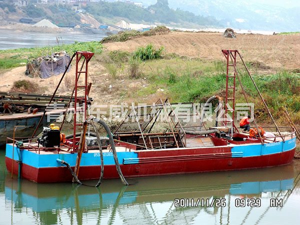 该抽沙设备主要适用于水库、河道、湖泊等宽车辆不能进入的阔水域作业,工作流程为抽沙运输船开到抽沙区域,利用抽沙船自带的抽砂系统将沙子抽进船舱,抽满船舱后运输至岸边,打开底舱门,将沙子卸到水里,再用岸边的小型抽沙机抽出并输送至码头或者直接用抽砂泵讲沙子从船舱输送至码头。该设备结构简单、工作量大、易损件少,抽出来的沙子含泥量低,无石块,沙子质量好,是近几年采沙、清淤比较常用的工具。