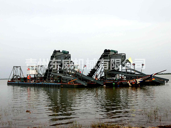 淘金船是一种集采矿作业、选矿作业为一体的水上联合工厂,是一种砂金、铁粉、锡矿、钨矿等重金属开采设备,它包括链斗挖掘系统、选矿及供水系统、废矿及尾矿排弃系统、甲板机械、船体、上部钢构、供电等几个基本系统。