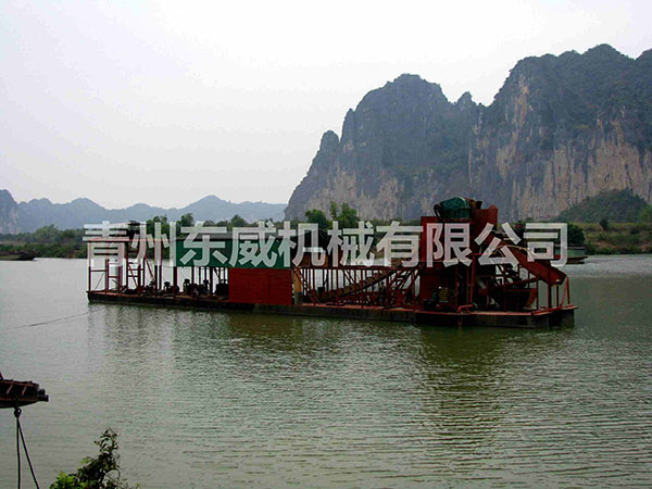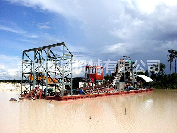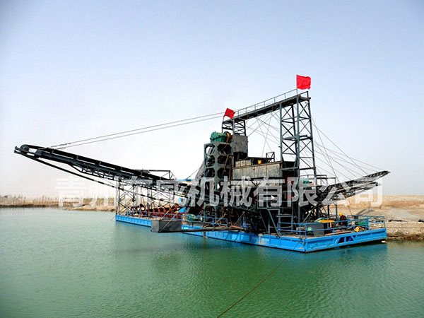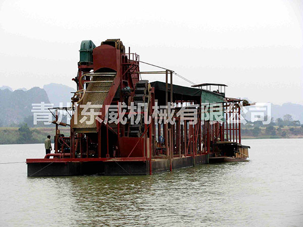 淘金船是一种集采矿作业、选矿作业为一体的水上联合工厂,是一种砂金、铁粉、锡矿、钨矿等重金属开采设备,它包括链斗挖掘系统、选矿及供水系统、废矿及尾矿排弃系统、甲板机械、船体、上部钢构、供电等几个基本系统。